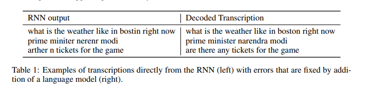 为了减少训练期间的方差,作者们在前馈层当中添加了 5% 到 10% 的弃用率。然而,这并不会影响到递归隐藏激活函数。此外,作者还在系统当中集成了一套 N-gram 语言醋,这是因为 N-gram 模型能够轻松利用大规模未标记文本语料库进行训练。下图所示为 RNN 转录示例: