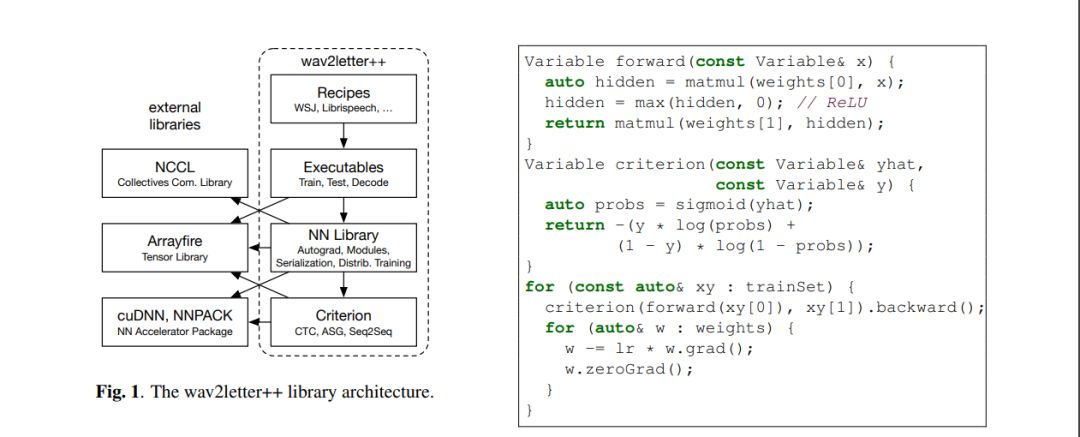之所以使用 ArrayFire 张量库,是因为它能够在多个后端上执行,包括 CUDA GPU 后端与 CPU 后端,从而显著提升执行速度。与其它 C++ 张量库相比,在 ArrayFire 中构建及使用数组也相对更容易。图左所示为如何构建及训练具有二进制交叉熵损失函数的单层 MLP(多层感知器)。