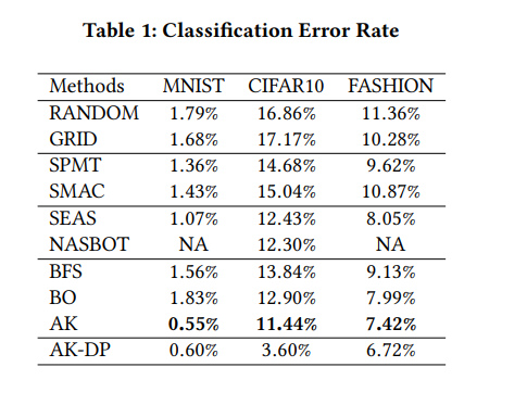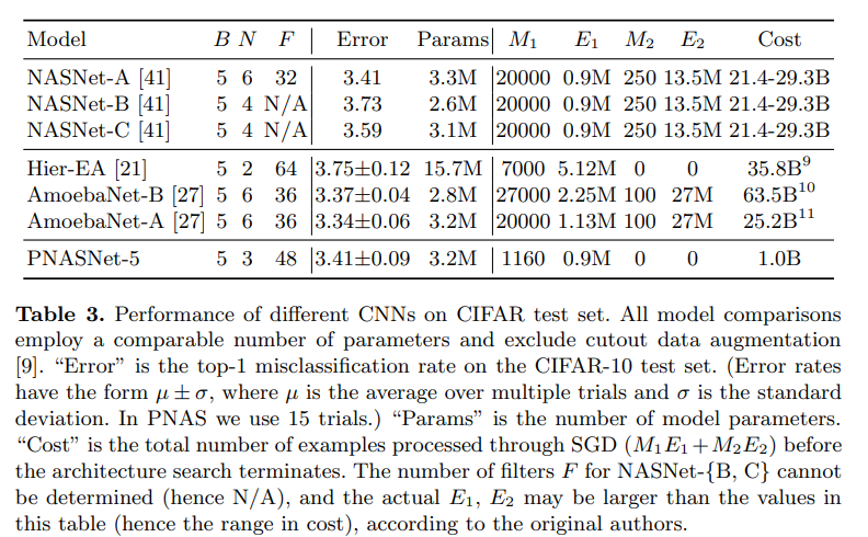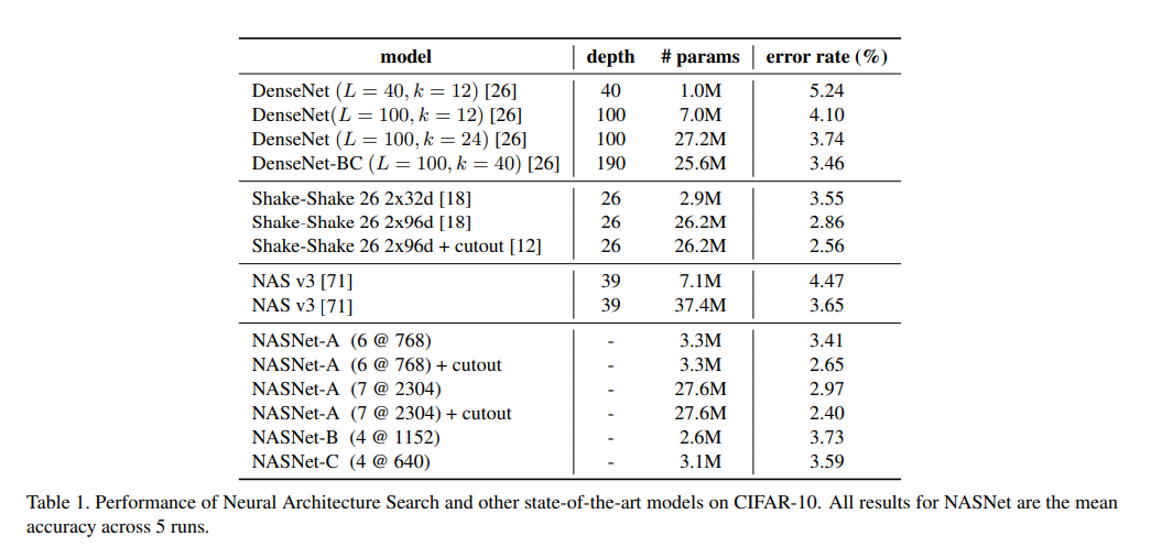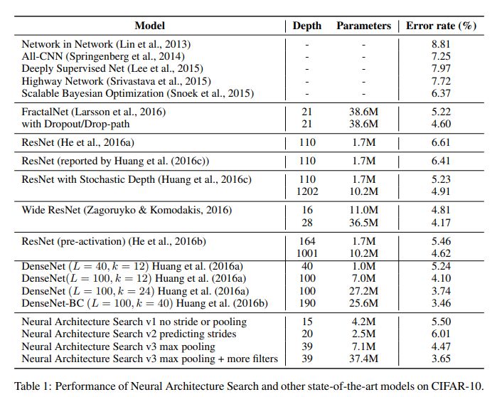 下面是 CIFAR-10 数据集上神经结构搜索的性能: