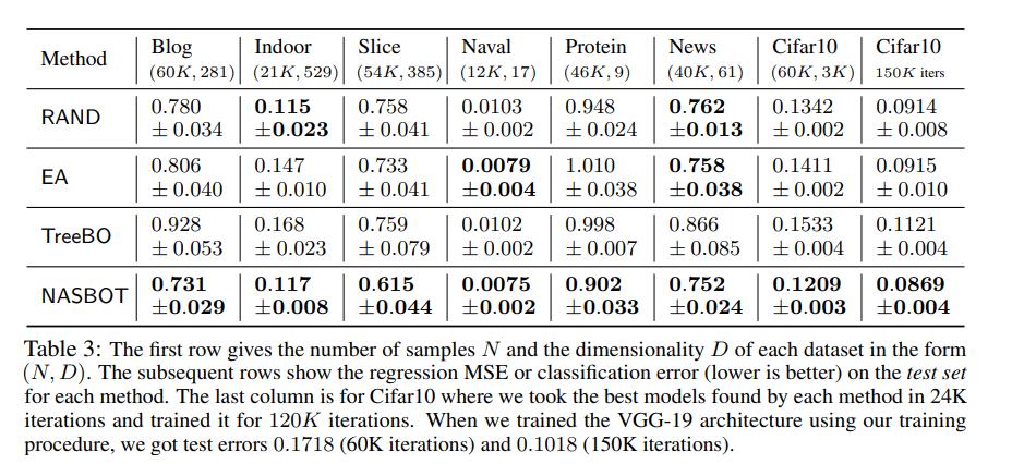 这篇论文提出了一种基于高斯过程 (贝叶斯优化,即 BO) 的神经结构搜索框架 NASBOT。这是通过在神经网络体系结构的空间中开发一个距离度量来实现的,该距离度量可以通过最优传输程序来计算。