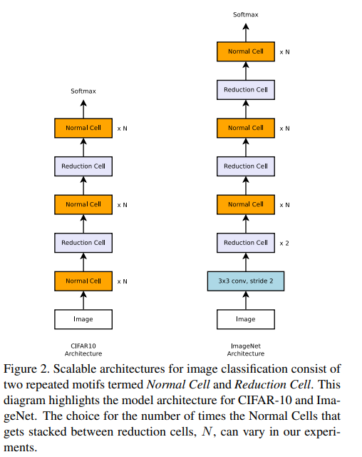 通过使用步长为 1 或步长为 2 的基本单元叠加预定数量的副本,可以将单元叠加转换为 CNN,如上图所示。然后,在步长为 2 的单元之间的步长为 1 的单元数量,调整为最多可以有 N 个。在网络的顶层引入了平均池化和 softmax 分类层。