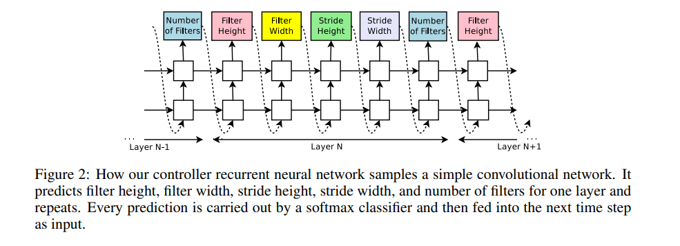 神经网络结构搜索中,该控制器用于生成神经网络的结构超参数。在下图中,控制器用于生成一个卷积神经网络。控制器预测滤波器高度、滤波器宽度和步长。预测由 softmax 分类器执行,然后作为输入,输入到下一个时间步。一旦控制器完成了生成结构的过程,带有这个结构的神经网络就会建立起来,并用它进行训练。