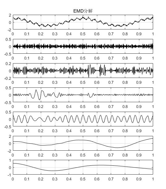 上图由7张图片组成,其中第1张为原始信号,后边依次为EMD分解之后得到的6个分量,分别叫做IMF1~IMF5,最后一张图为残差,每一个IMF分量代表了原始信号中存在的一种内涵模态分量。可以看出,每个IMF分量都是满足这两个约束条件的。