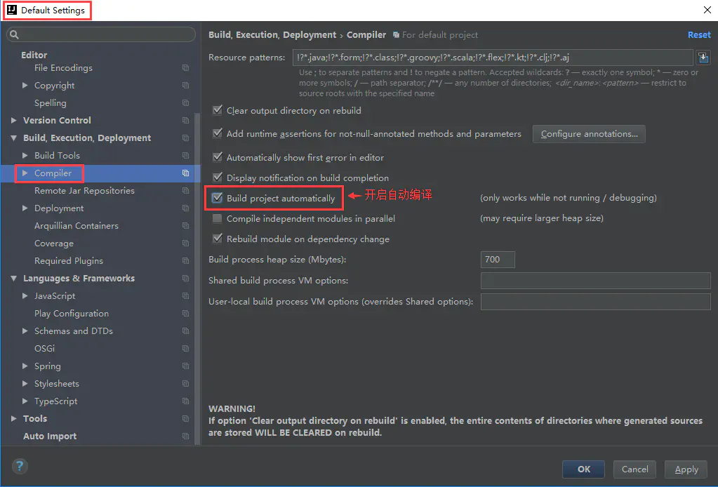 具体步骤:打开顶部工具栏 File -> Settings -> Default Settings -> Build -> Compiler 然后勾选 Build project automatically 。