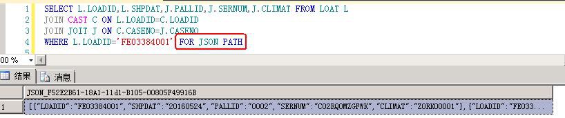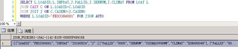 要将SELECT语句的结果以JSON输出,最简单的方法是在后面加上 FOR JSON AUTO :