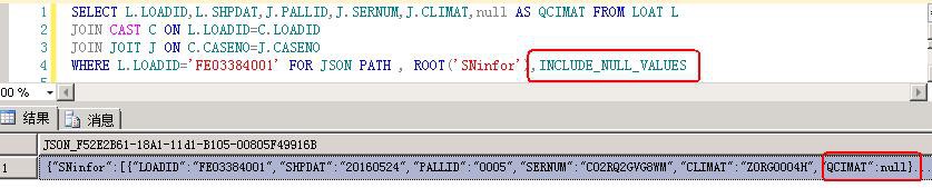 为NULL的数据在输出JSON时,会被忽略,若想要让NULL的字段也显示出来,可以加上选项INCLUDE_NULL_VALUES,该选项也适用于AUTO。