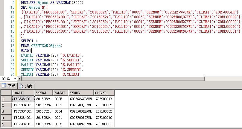 1 -------------1、------------- 2 declare @json as varchar(8000) 3 set @json='[ 4 {"id":1178,"myObject.Plies":3,"myObject.Createtime":"2020-07-21T14:33:18.480"}, 5 {"id":1179,"myObject.Plies":3,"myObject.Createtime":"2020-07-21T14:36:27.457"}]' 6 select * from openjson(@json); 7 --key value type 8 --0 {"id":1178,"myObject.Plies":3,"myObject.Createtime":"2020-07-21T14:33:18.480"} 5 9 --1 {"id":1179,"myObject.Plies":3,"myObject.Createtime":"2020-07-21T14:36:27.457"} 5 10 11 -------------2、------------- 12 declare @json1 as varchar(8000) 13 set @json1='[ 14 {"id":1178,"myObject.Plies":3,"myObject.Createtime":"2020-07-21T14:33:18.480"}, 15 {"id":1179,"myObject.Plies":3,"myObject.Createtime":"2020-07-21T14:36:27.457"}] 16 ' 17 select * from openjson(@json1) 18 with( 19 id varchar(10) '$.id', 20 Plies int '$."myObject.Plies"', 21 Createtime datetime '$."myObject.Createtime"' 22 ); 23 --id Plies Createtime 24 --1178 3 2020-07-21 14:33:18.480 25 --1179 3 2020-07-21 14:36:27.457 26 27 -------------3、------------- 28 declare @json2 as varchar(8000) 29 set @json2='{"myRoot":[ 30 {"id":1178,"myObject":{"Plies":3,"Createtime":"2020-07-21T14:33:18.480"}}, 31 {"id":1179,"myObject":{"Plies":3,"Createtime":"2020-07-21T14:36:27.457"}} 32 ]}' 33 34 select * from openjson(@json2,'$.myRoot') 35 with( 36 id varchar(10) , 37 Plies int '$.myObject.Plies', 38 Createtime datetime '$.myObject.Createtime' 39 ); 40 --id Plies Createtime 41 --1178 3 2020-07-21 14:33:18.480 42 --1179 3 2020-07-21 14:36:27.457