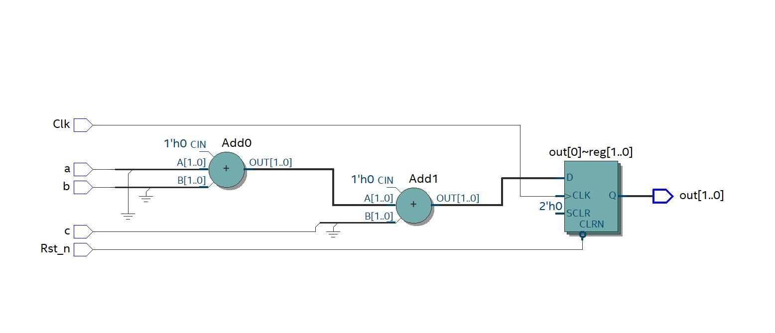 在这个过程中,out 的这个 00 的状态是我们不希望看到的;为什么这里out的值 会相比于a+b=d 的值会有一拍的的延迟呢?原因就是中间加的 这一个 d = a+b ,从而使生成的电路中多出一个寄存器(如下图),所以在always@ 语句块中推荐使用非阻塞赋值。