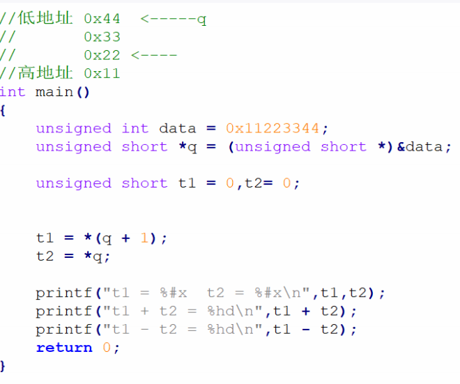 第四阶段—一级指针的特点:unsigned int data = 0x11223344; unsigned short *q = NULL; unsigned short t1 = 0; unsigned short t2 = 0; 1. 要求指针q保存data的地址. 2. 要求利用q读取data的低2个字节赋值給t1 要求利用q读取data的高2个字节赋值給t2