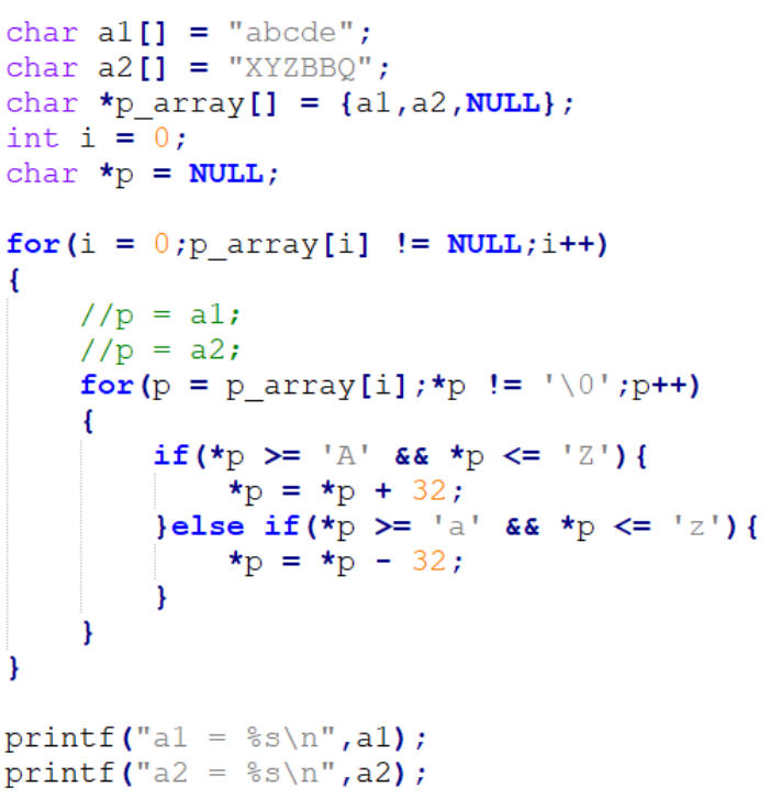 第四阶段—指针—指针数组:char a1[] = "abcde"; char a2[] = "HELLO"; char *p_array[] = {a1,a2,NULL}; 1.要求把通过p_array把a1所有小写字符换成大 写字符. 2.要求把通过p_array把a2所有大写字符换成小 写字符.(先实现单个数组的变化,再把一级指针用二级指针替换)
