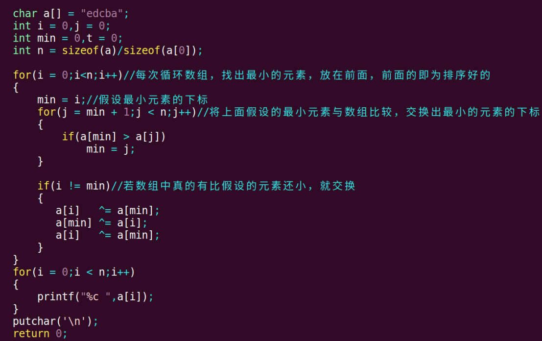 数组——要求使用简单选择排序,将 char a[] = "edbca" 从大到小排序并输出('\0'不参加排序)