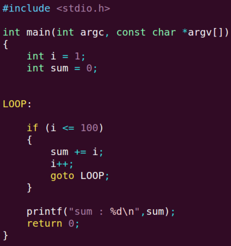 c语言控制语句——如何使用goto实现1加到100?不能使用循环。