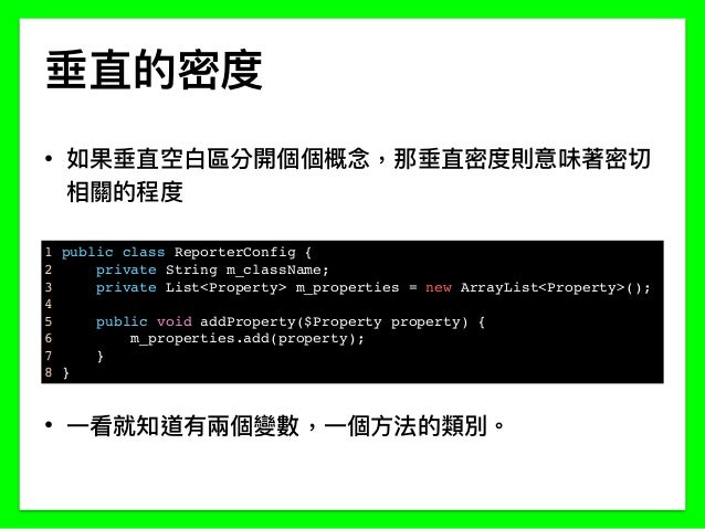 - 垂直的密度 • 如果垂直空⽩白區分開個個概念念,那垂直密度則意味著密切 相關的程度 • ⼀一看就知道有兩兩個變數,⼀一個⽅方法的類別。 1 public class ReporterConfig { 2 private String m_className; 3 private List<Property> m_properties = new ArrayList<Property>(); 4 5 public void addProperty($Property property) { 6 m_properties.add(property); 7 } 8 }