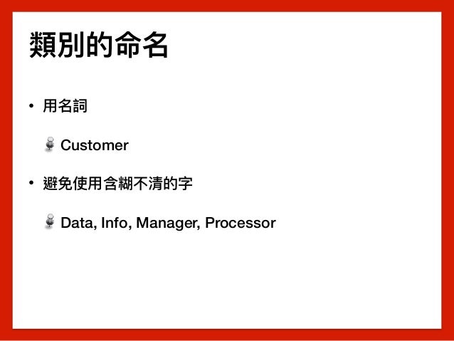 - 類別的命名 • ⽤用名詞 Customer • 避免使⽤用含糊不清的字 Data, Info, Manager, Processor