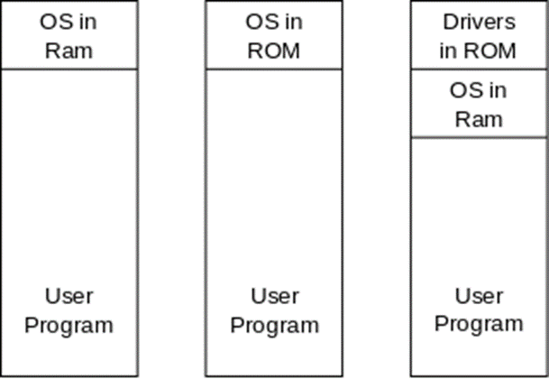 - 为每个作业重新加载操作系统(或没有操作系统)或从作业中保护操作系统;当然必须给与操作系统一定的RAM空间;可以有一个单独的操作系统地址空间,但只能在内核态下访问;可能会在ROM(BIOS)中放入一些驱动程序;