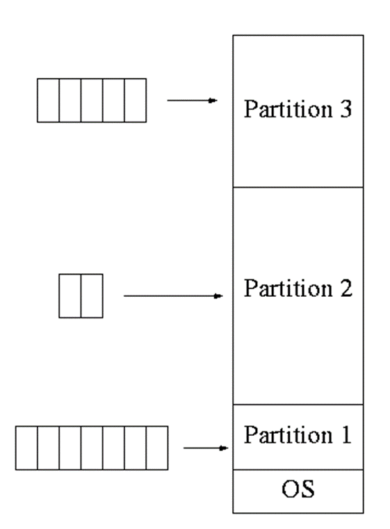 - 每个分区都是单道的,多道程序设计是通过跨分区进行的;