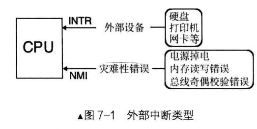 外部中断是通过两根信号线通知处理器的,一条是INTR(INTeRrupt),另一条是NMI(Non Maskable,Interrupt),分别用于传输可屏蔽中断信号和不可屏蔽中断信号。