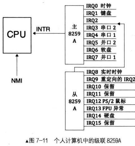 中断设备会连接到代理相应的IRQ接口,多个8259A芯片级联在一起可以支持更多的中断信号,一个8259芯片支持8种中断,两个芯片支持15种中断(其中1个IRQ用来连接从片)。