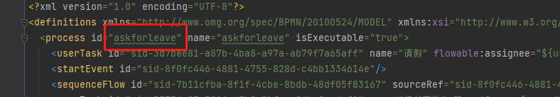 ProcessInstance instance = runtimeService.startProcessInstanceByKey("askforleave", params); 这里的流程实例"askforleave" 是生成的流程图xml文件的process 的id