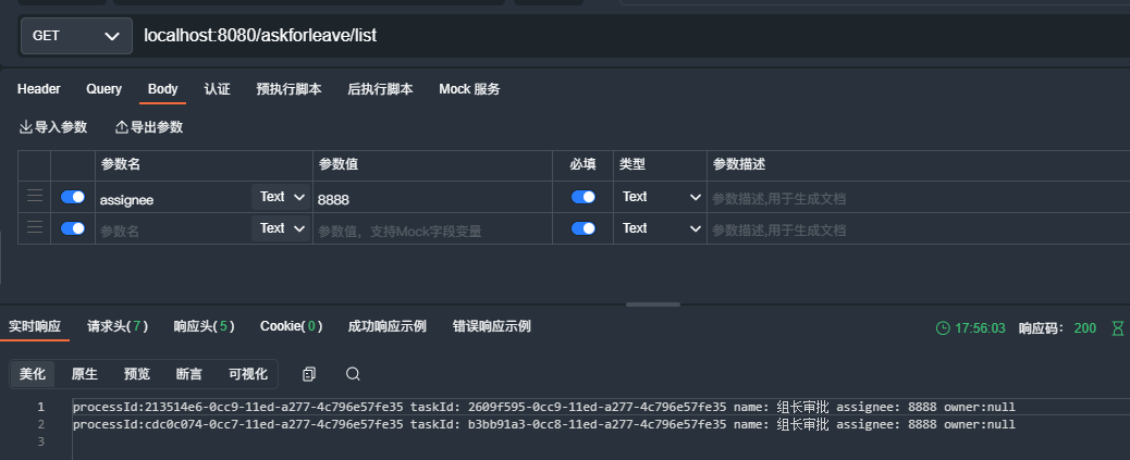 先调用步骤9接口传入上一步设置的manager的值可以查看经理代办任务,可以看到经理的代办任务id(taskId),然后进行审核。