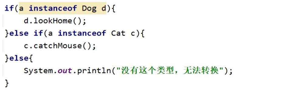 解决办法,instanceof判断为何类型并强转后再调用(如d.lookHome; c.catchMouse;)