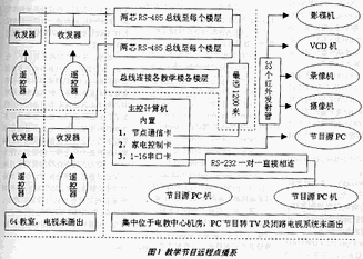 整个系统的结构见图1。安装于电教中心机房的主控计算机通过节点通信卡获得每个教室里的遥控器操作请求,根据系统数据设置对相应的请求进行解释,然后通过家电控制卡对指定的通道发出控制命令控制分配给该教室对应的播放设备。该设备播放的视频、音频通过闭路电视系统分频道,被送到相应的教室电视上再现,从而实现交互式多媒体教学。