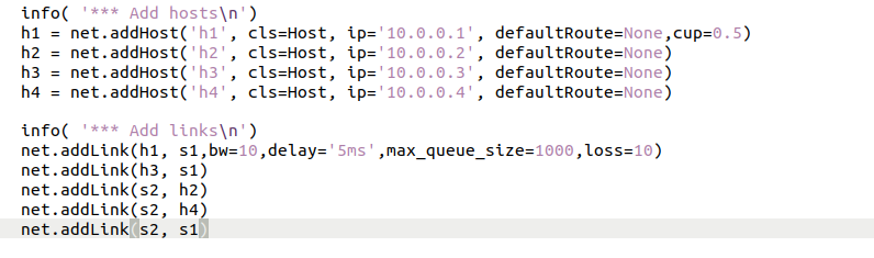 b) h1和s1之间的链路带宽为10,延迟为5ms,最大队列大小为1000,损耗率50。