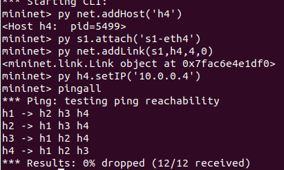 五、在4 b)的基础上,在Mininet交互界面上新增1台主机并且连接到交换机上,再测试新拓扑的连通性。