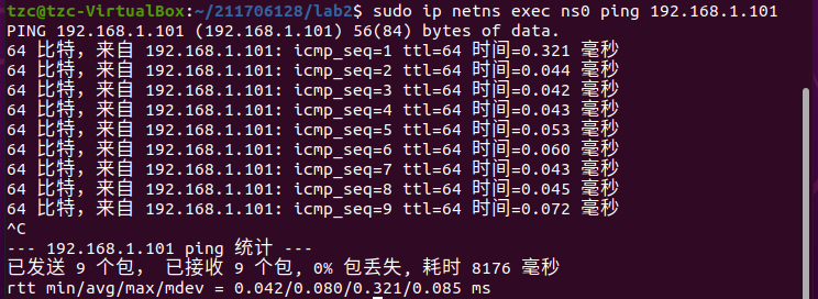 1、创建OVS交换机,并以ovs-switchxxx命名,其中xxx为本人在选课班级中的序号,例如ovs-switch001, ovs-switch088等。在创建的交换机上增加端口p0和p1,设置p0的端口号为100,p1的端口号为101,类型均为internal;为了避免网络接口上的地址和本机已有网络地址冲突,需要创建虚拟网络空间(参考命令netns)ns0和ns1,分别将p0和p1移入,并分别配置p0和p1端口的ip地址为190.168.0.100、192.168.0.101,子网掩码为255.255.255.0;最后测试p0和p1的连通性。