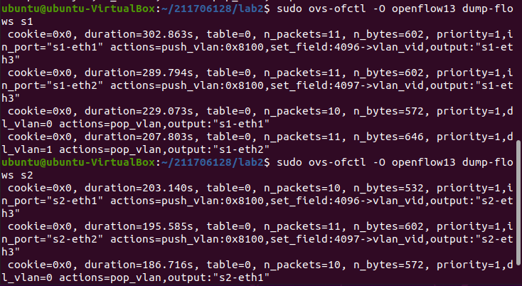 3、通过命令行终端输入“ovs-ofctl”命令,直接在s1和s2上添加流表,划分出所要求的VLAN。