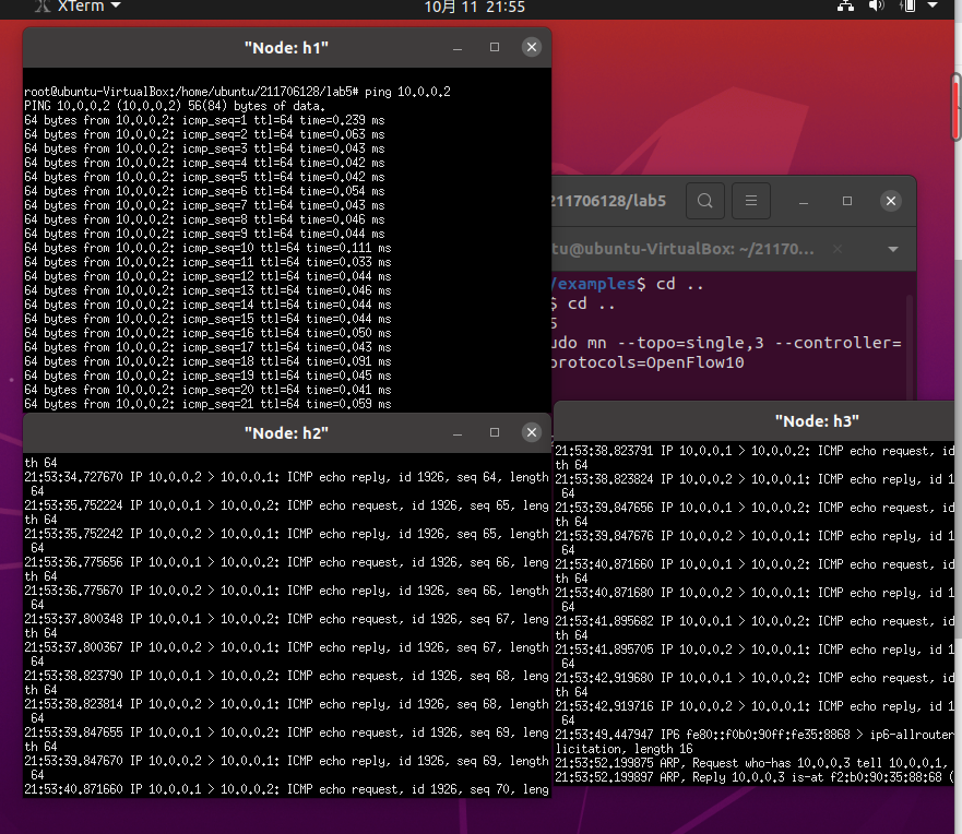 1、重新搭建(一)的拓扑,此时交换机内无流表规则,拓扑内主机互不相通;编写Python程序自定义一个POX模块SendFlowInSingle3,并且将拓扑连接至SendFlowInSingle3(默认端口6633),实现向s1发送流表规则使得所有主机两两互通。