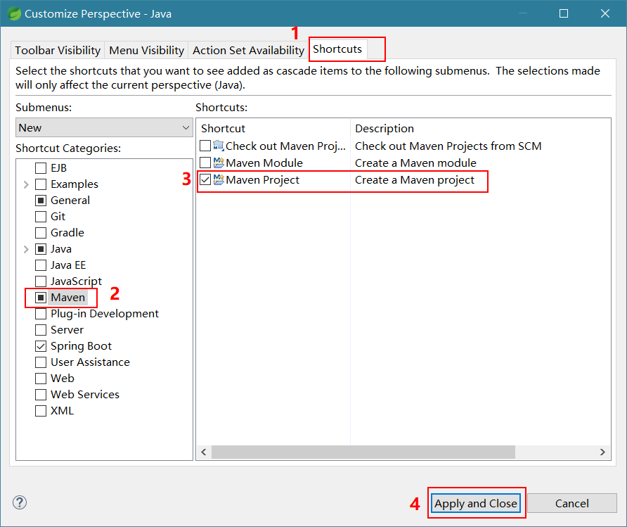 2.选中Shortcuts-->选择你要添加的快捷方式类别-->选择你要添加的快捷方式--->Apply and Close