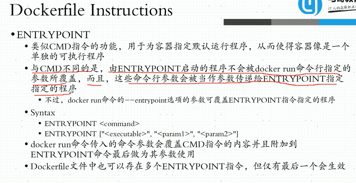 • 如果 ENTRYPOINT 使用了 shell 模式,CMD 指令会被忽略。