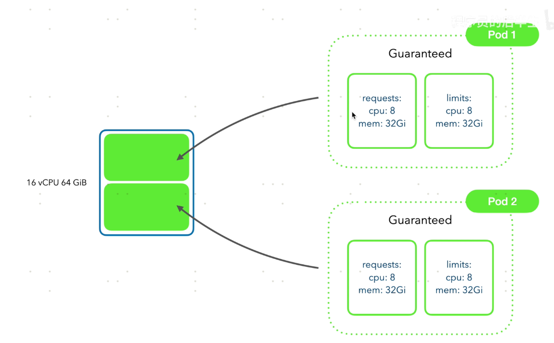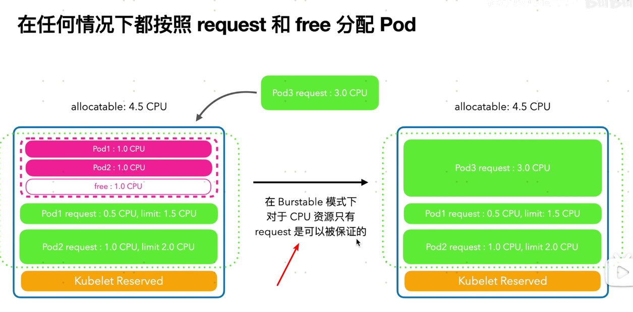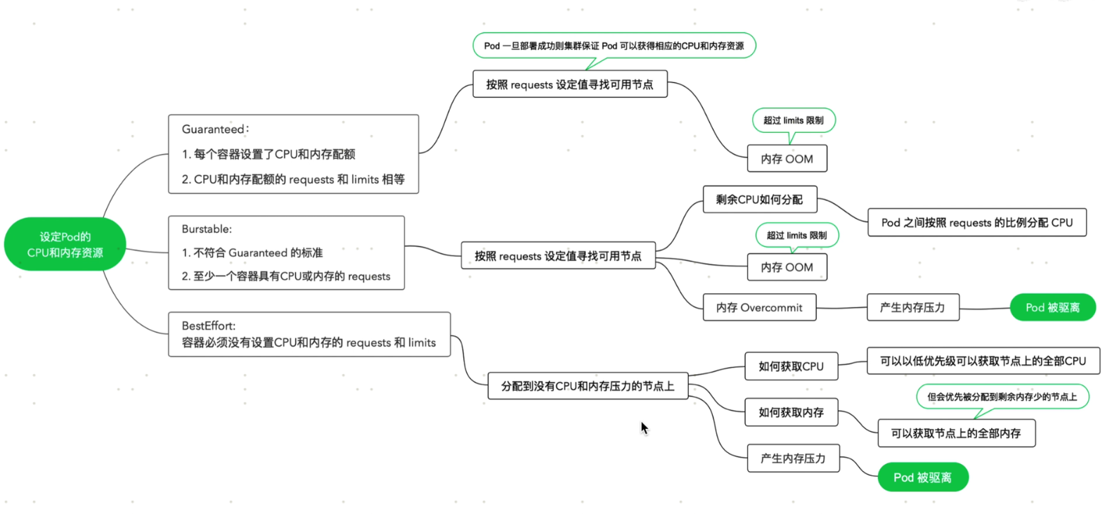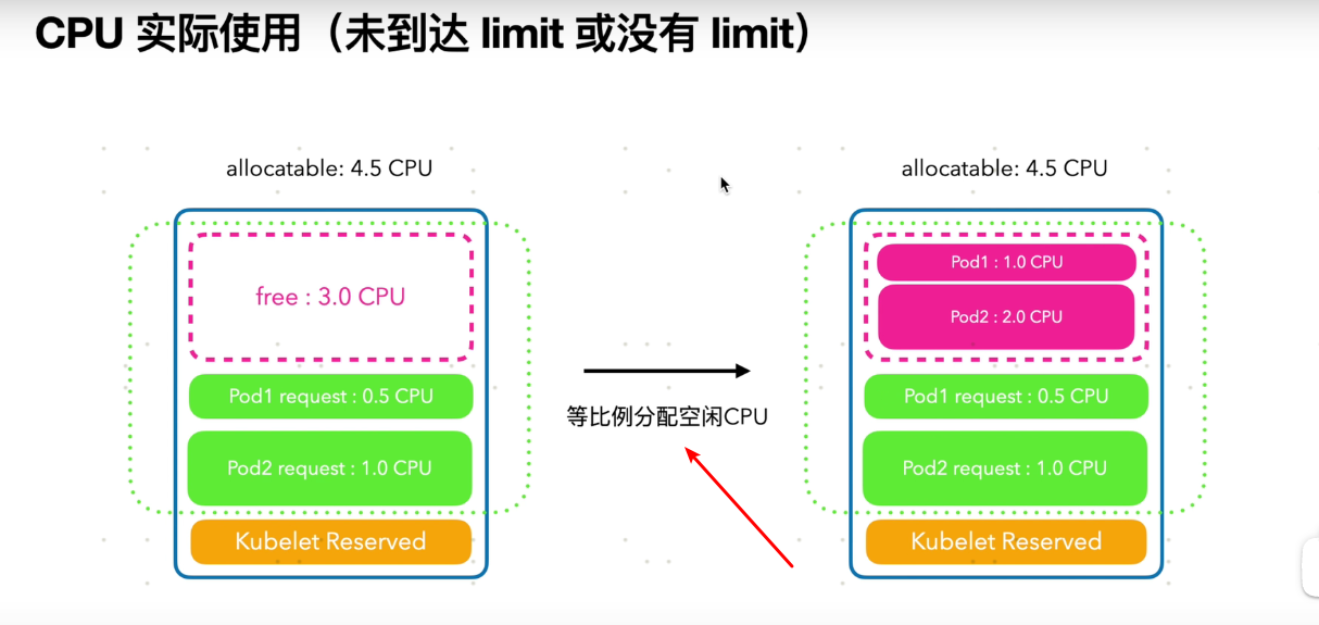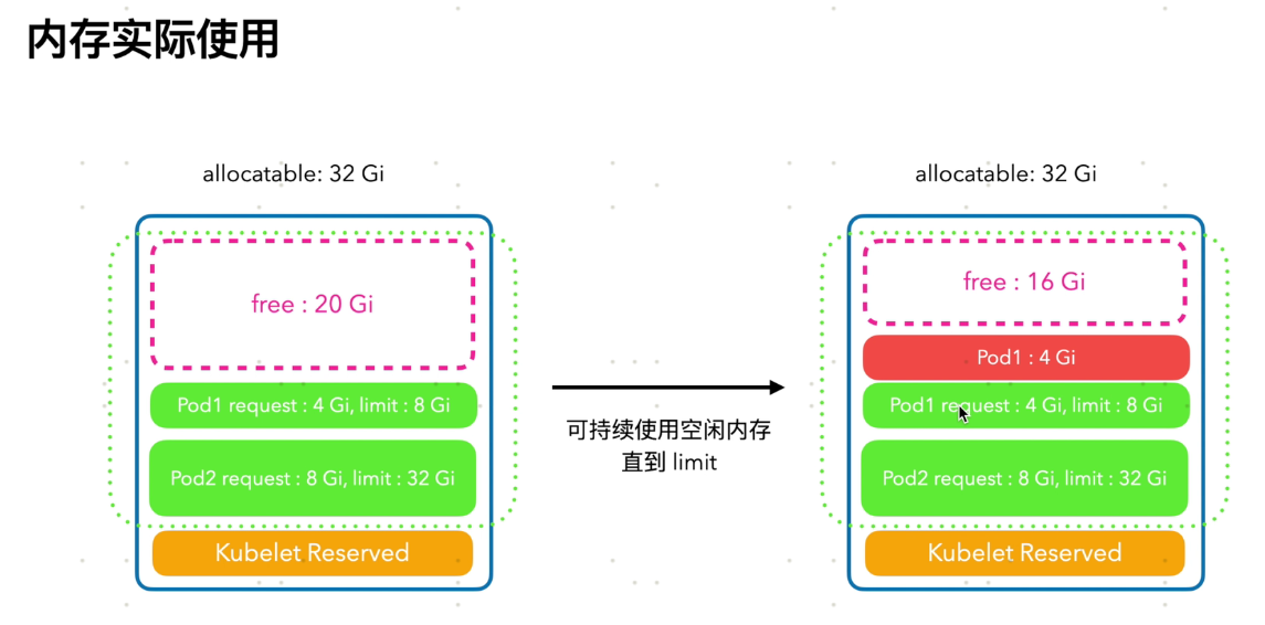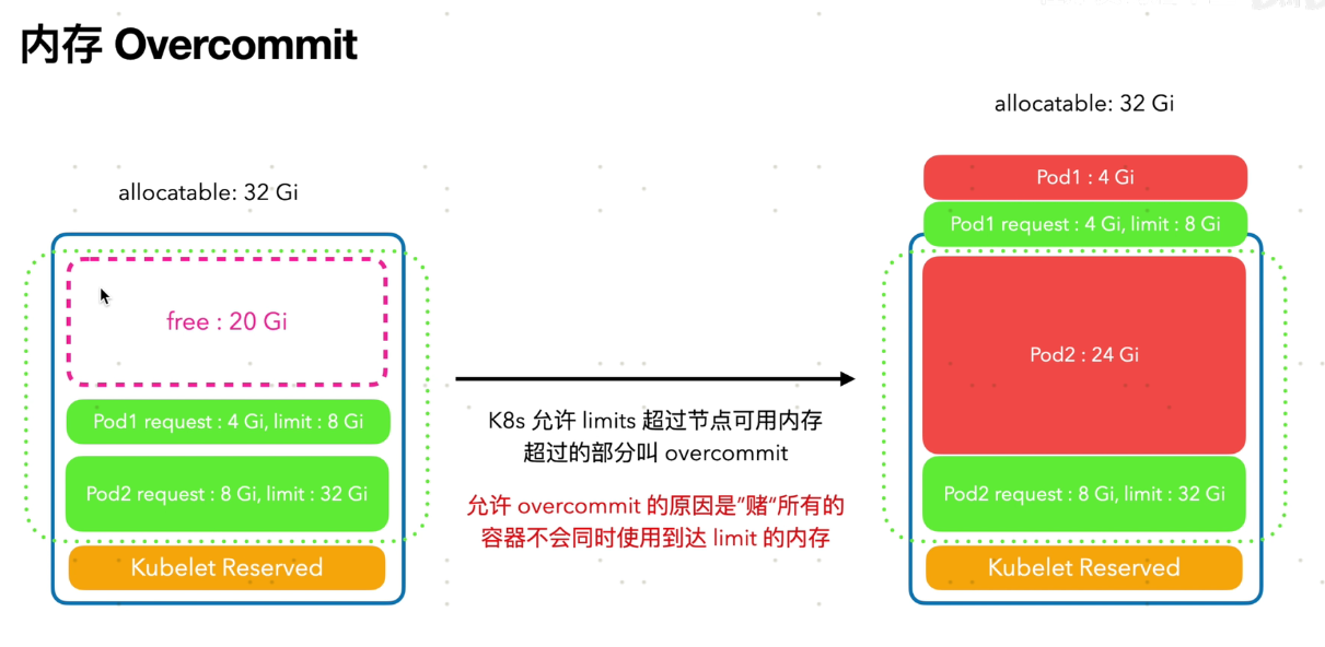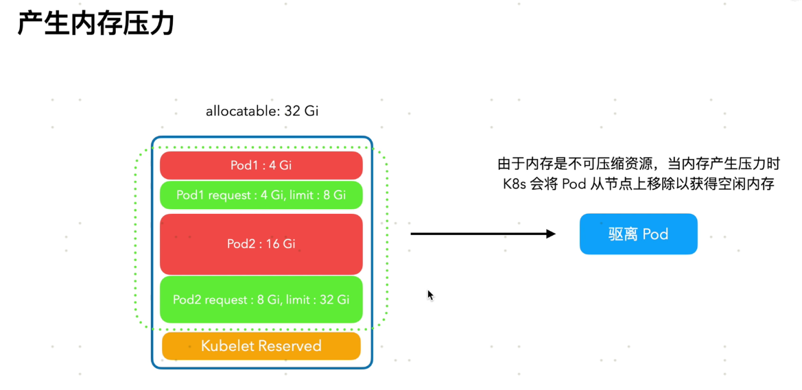 当worker node上的内存不够分配,两个pod都的内存都将达到limit限制时,node将会驱逐一个pod.
