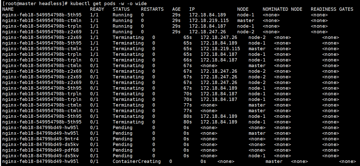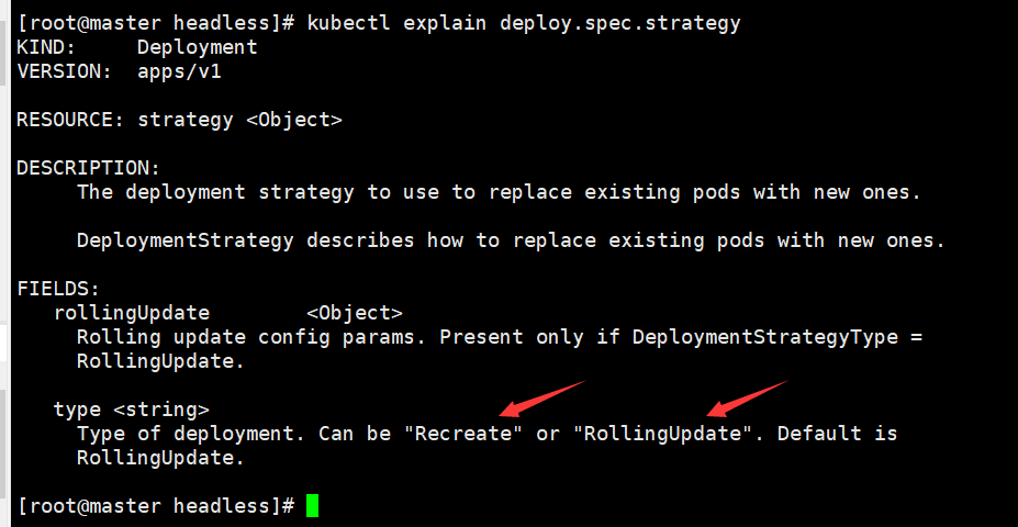 Deployment的更新策略有两种,一种是Recreate,再更新时把原有的pod全部删除,然后再创建新的。一种是rollingUpdate.