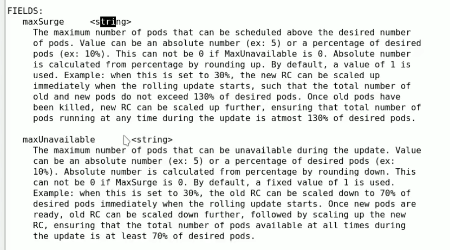 RollingUpdate有两个字段,maxSurge 最大可多出的pod个数或比例, MaxUnavailable最大不用pod数量。