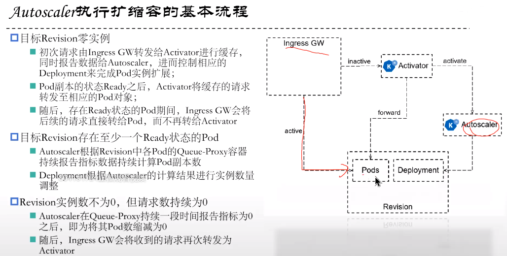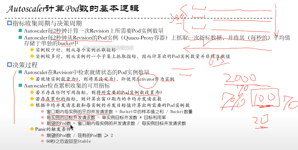 autoscaler 每2秒从pod上抓去一次指标数据,将其存在pod的bucket上。在一个stable window内计算其平均值,然后评估改revision是否需要扩缩容
