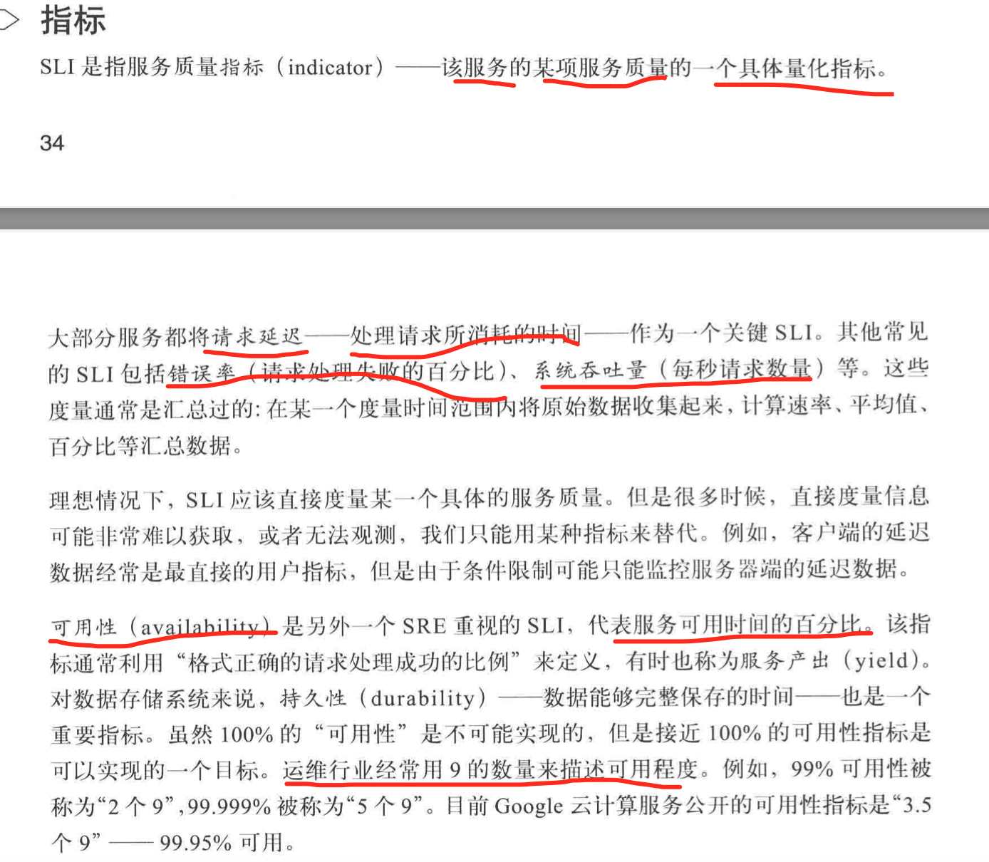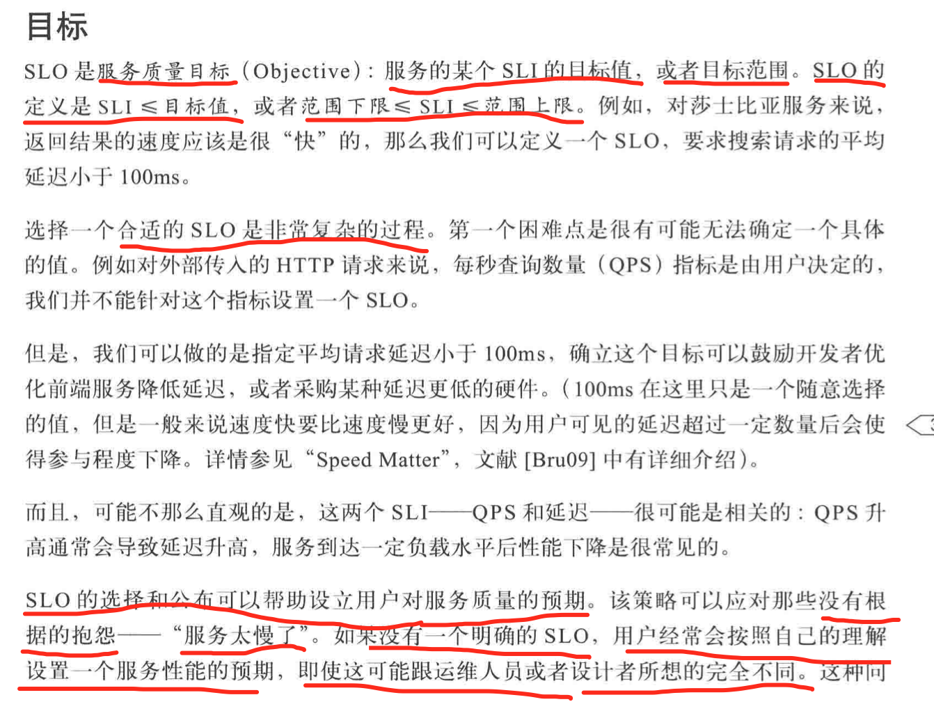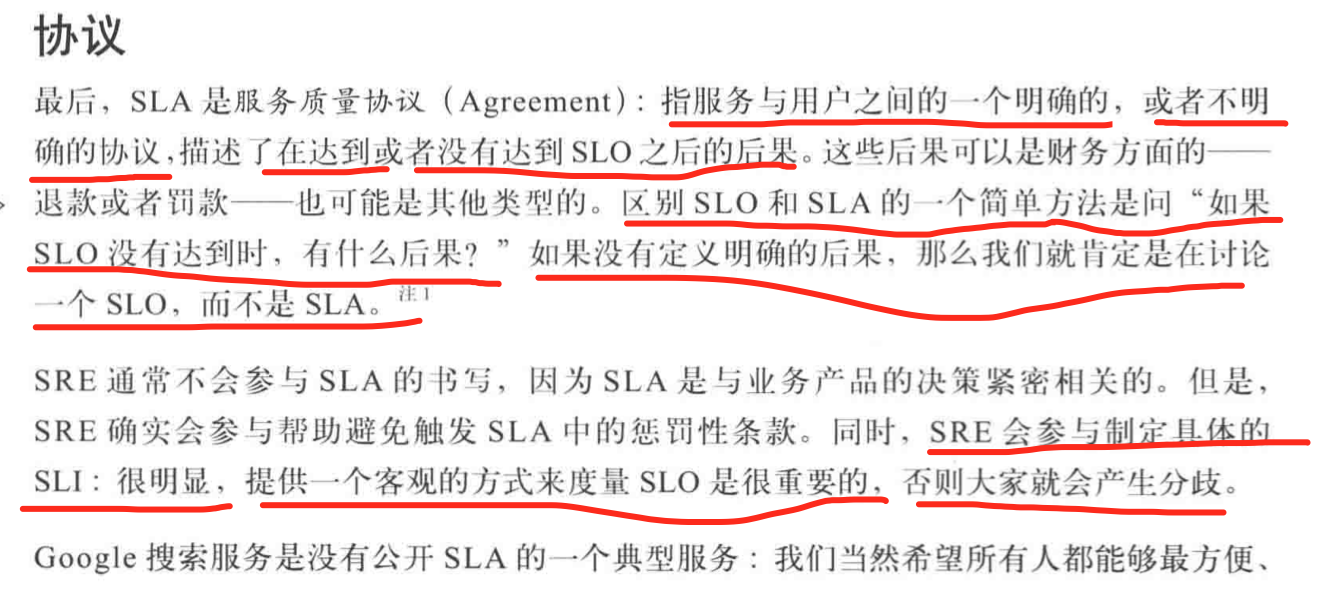 SLA: 服务与用户之间的一个明确的,或者不明确的协议,描述了 达到 或 未达到 SLO 的后果。