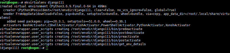python3 -m venv django11 #创建环境 source bin/activate #进入 deactivate #退出