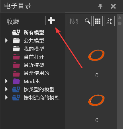 如果你要添加自己的模型库,或者寻找以前版本的模型库。则需要点击“电子目录”标题下方的“+”号。