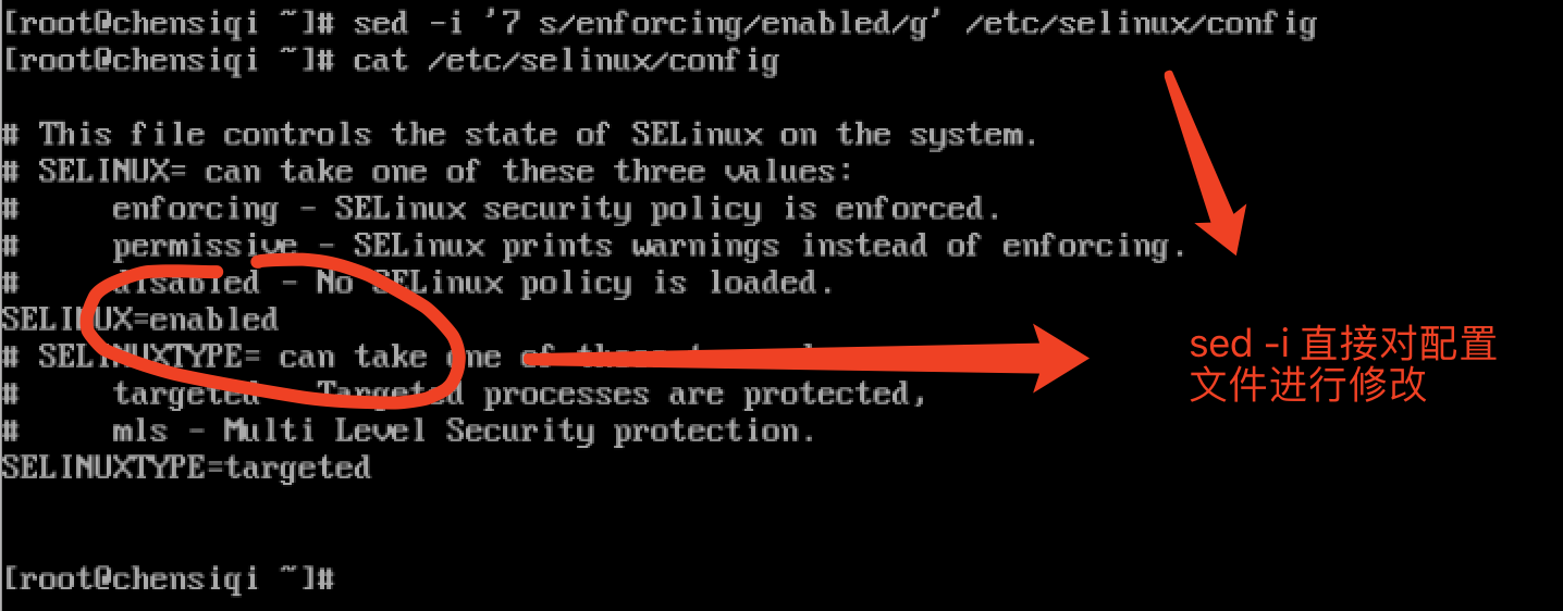 sed -i '7 s/enforcing/enabled/g' /etc/selinux/coinfig - 命令行(临时,重启后失效)