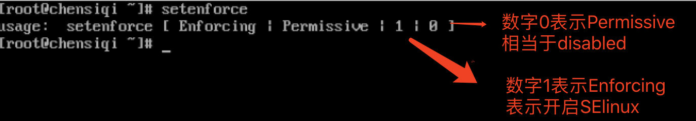 - setenforce:用于命令行管理SELinux的级别,后面的数字表示设置对应的级别