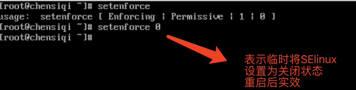 提示:修改配置SElinux后,要想使生效,必须要重启系统。因此,可配合使用setenforce 0 这个临时关闭的命令,这样在重启前后都可以使得SElinux关闭生效了,也就是说无需立刻重启服务器了,在生产环境下Linux机器是不能随意重启。