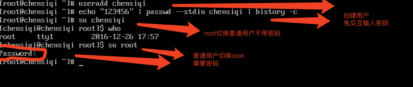 注意:这种方式虽然能免提示的直接创建用户,但是密码信息都被记录在了命令的历史记录里,因此,在创建完成以后切记history