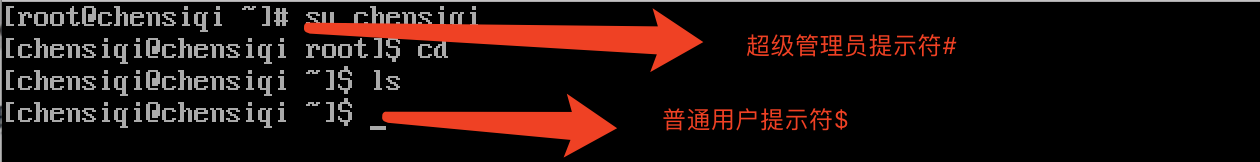 - $符号是普通用户的命令提示符,#符号是超级管理员的提示符。示例如下:
