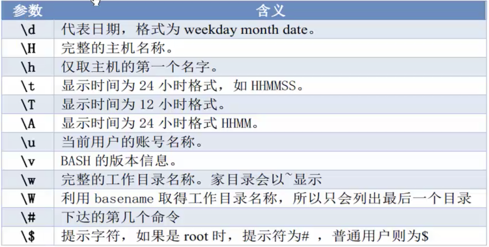 - Linux命令提示符由PS1环境变量控制。示例如下: