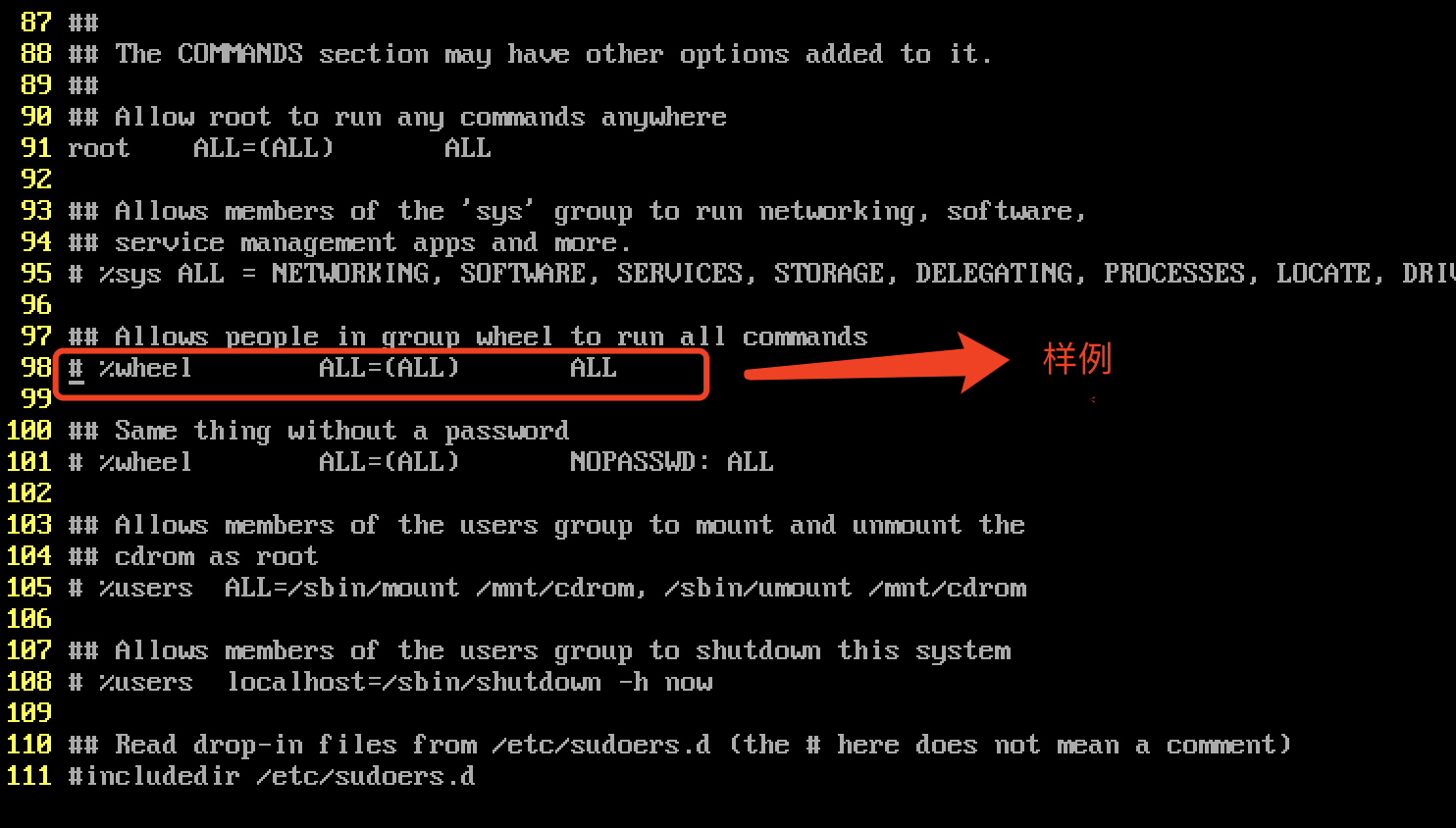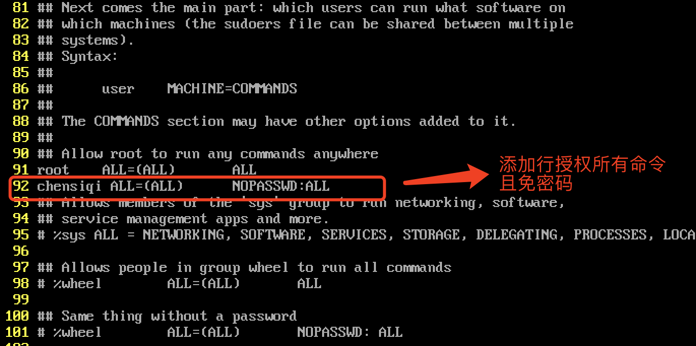 - visudo或者vi /etc/sudoers,在91行下边加入,或者其他位置加入皆可。