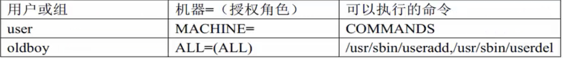 如果是针对用户组,则对应的授权命令如下: % 用户组 机器=(授权使用哪个角色的权限) /usr/sbin/useradd