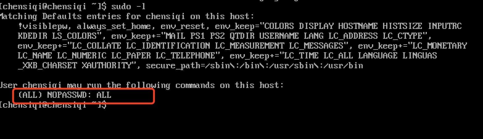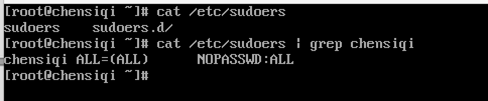 echo "chensiqi ALL=(ALL) NOPASSWD:ALL" >>/etc/sudoers
