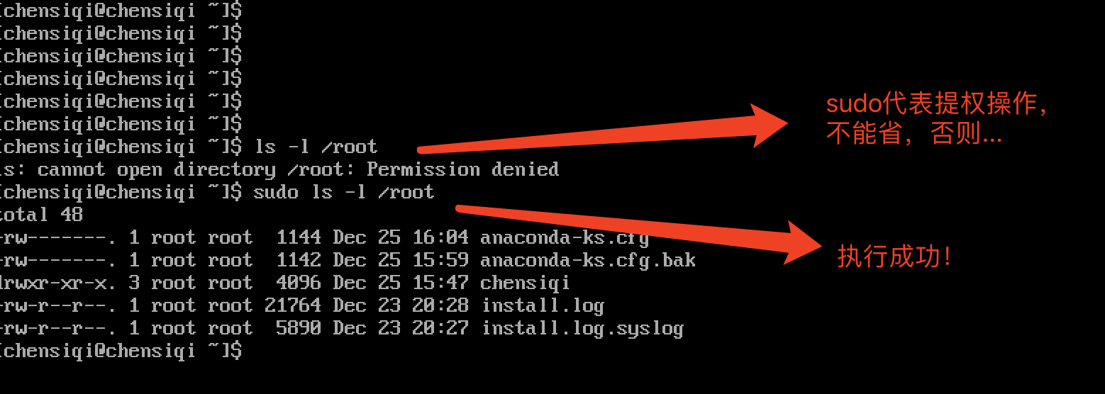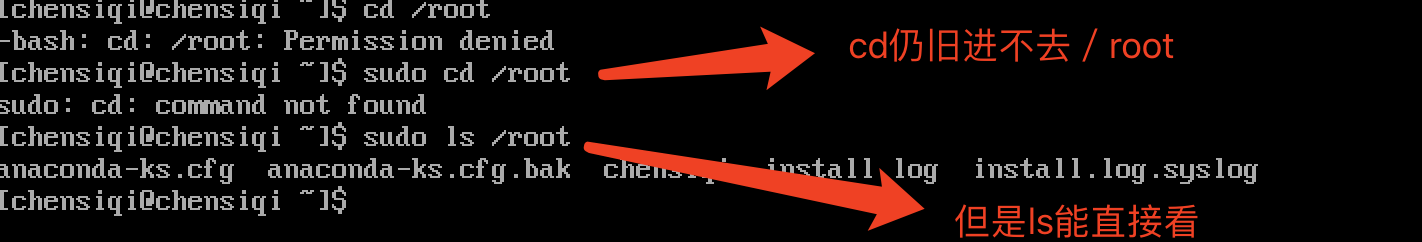 - 第三步,此时再登陆chensiqi用户,就可以通过执行类似sudo ls -l /root (sudo后面追加正常命令)的命令来以root用户的权限管理系统了,如下: